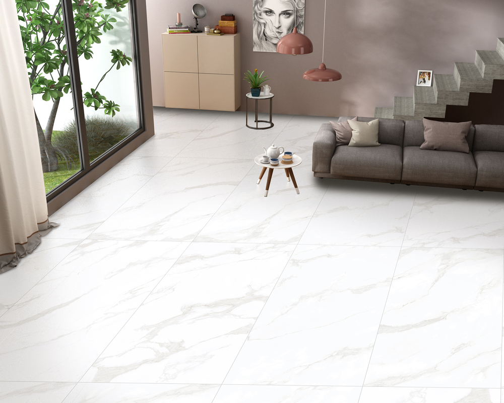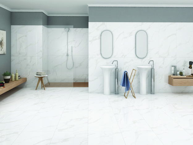 Πλακάκι ιδανικό για δάπεδο, ματ (βγαίνει και σε γυαλιστερό). Εμφάνιση μαρμάρου, λευκό με γλυκά γκρι νερά